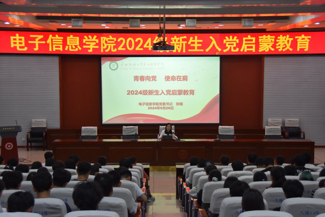 9月26日晚,电子信息公司党委在科技楼报告厅分两批开展2024级新生入党启蒙教育,公司党委书记张婧主讲,2024级550余名新生参加。