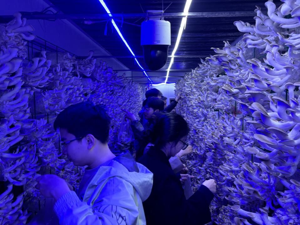 在正式采摘前,李云教授从数字智慧蘑菇仓的研发背景、技术亮点及研发意义等方面进行了简要介绍。她表示,数字智慧蘑菇仓运用物联网、人工智能技术等技术实现蘑菇生长状态的检测,并通过远程控制,自动调节蘑菇生长所需的温度、湿度和光照等条件,实现无人种植。该项目是与农投集团联合开展的产学研合作项目,在项目实施过程中,员工能将所学的理论知识与产业应用相结合,实践创新能力得到大幅提升。