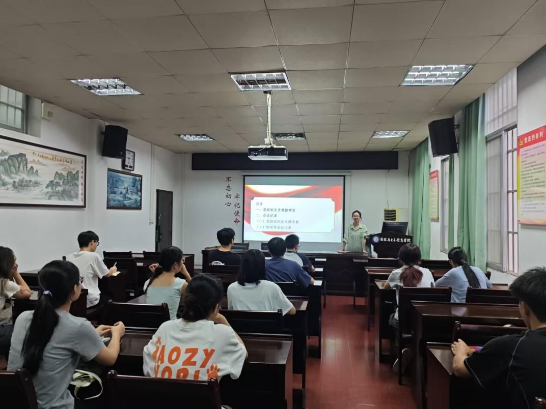 韦秋竹围绕党组织关系转接、会议记录规范要求等内容进行讲解。详细介绍了毕业生党员组织关系转接的三种情形:已落实工作单位、升学和未落实工作单位,并分别说明了各类情况下的转接要求。她特别强调转接过程中的关键环节,包括准确获取转入党支部信息、区分区内区外转接流程、及时跟踪回执情况等。针对会议记录规范,韦秋竹结合《广西发展党员工作手册》对各支部提出要求,通过实际案例,展示了完整的会议记录模板,包括会议基本信息记录、参会人员统计、会议内容详实记载等环节。