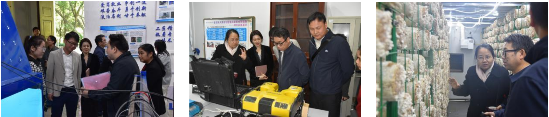 座谈结束后,调研团队实地参观了公司智能甘蔗切割机、水下航行器以及智能蘑菇方舱等项目。相关教师现场讲解了各个项目的研发历程、技术优势与推广应用情况,并重点介绍了其在助力农业现代化方面的实际成效。