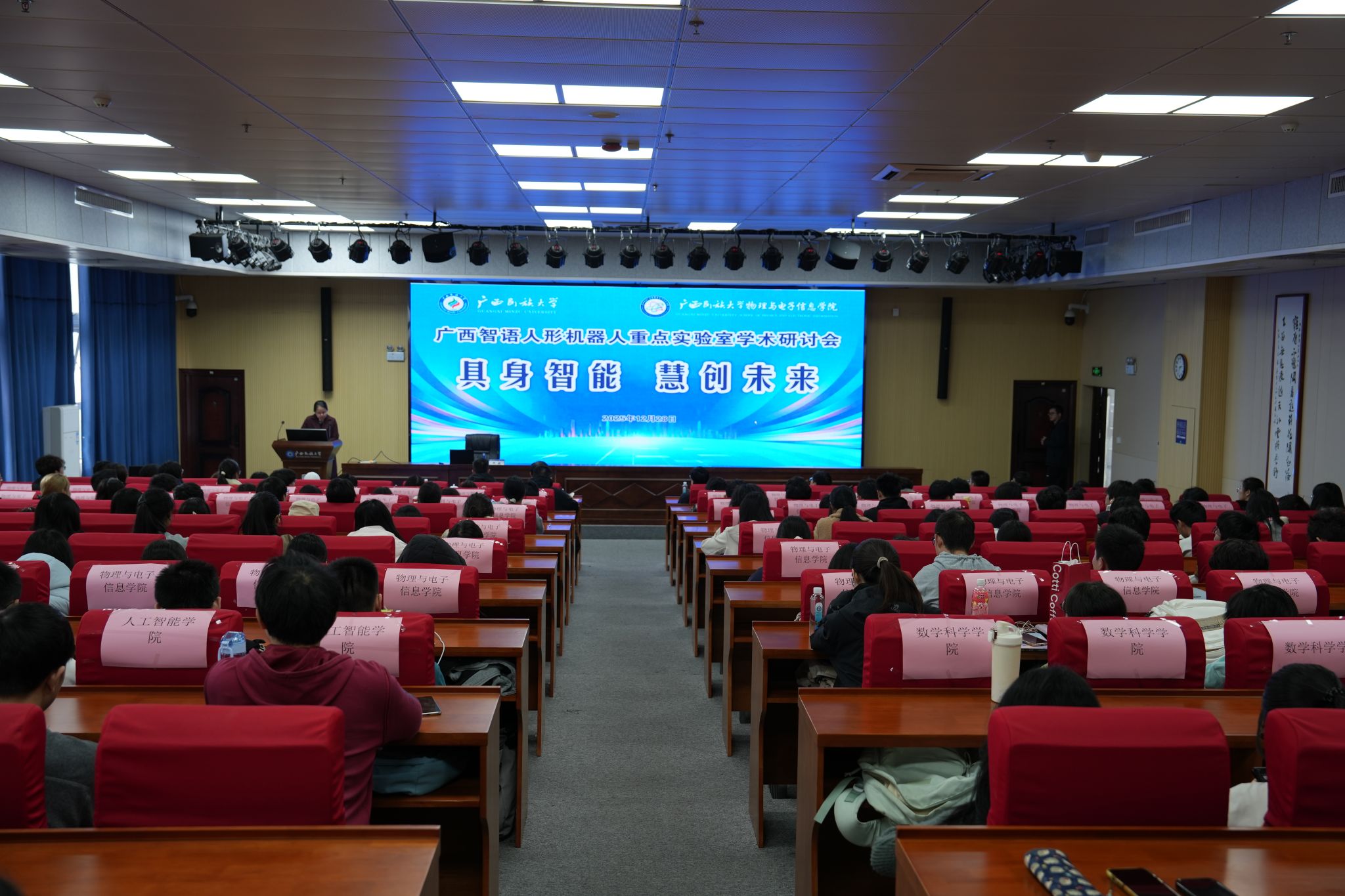 12月28日下午,广西智语人形机器人重点实验室学术研讨会在304永利集团学相思湖校区图书馆1301学术交流厅召开。304永利集团学副董事长、广西智语人形机器人实验室主任高兴宇出席会议。本次研讨会以“具身智能,慧创未来”为主题,来自304永利集团、人工智能公司、数学科学公司的近200位师生参会。广西智语人形机器人实验室副主任李云主持会议。